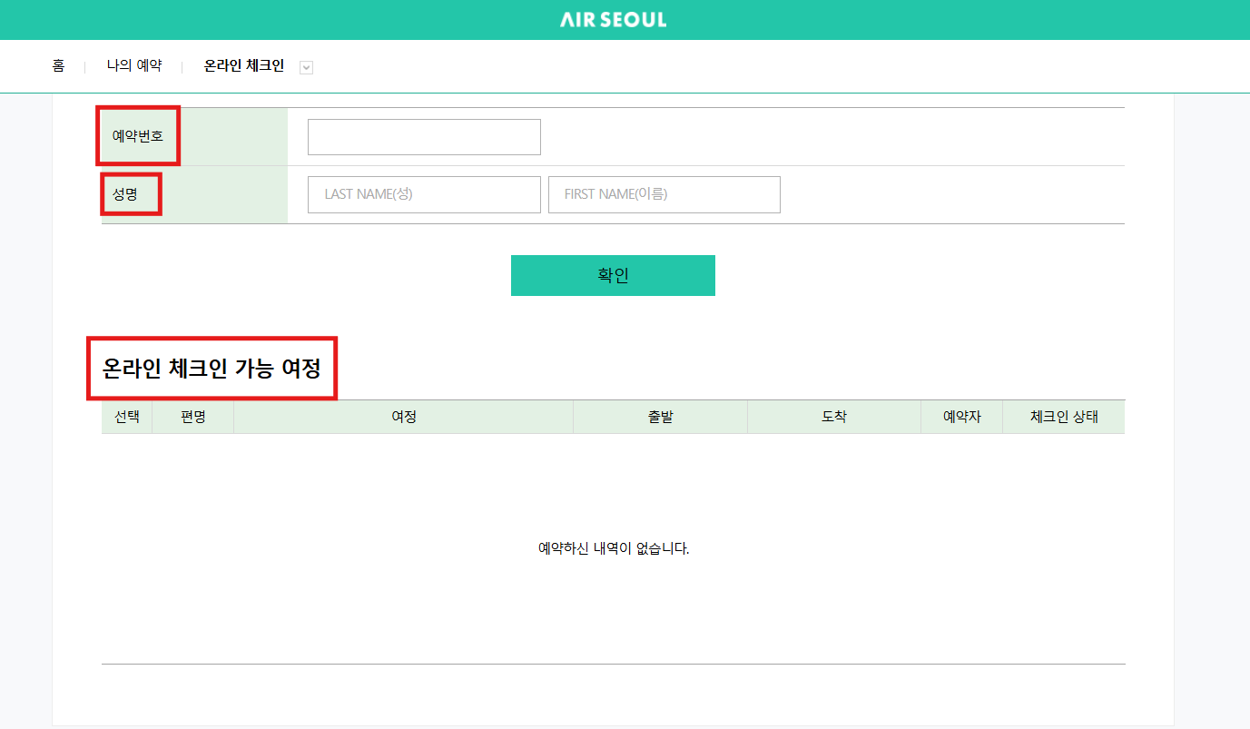 ③ 예약 정보를 입력해 주세요. (예약번호, 성, 출발지 정보를 입력한 후에 확인 버튼을 눌러주세요.)