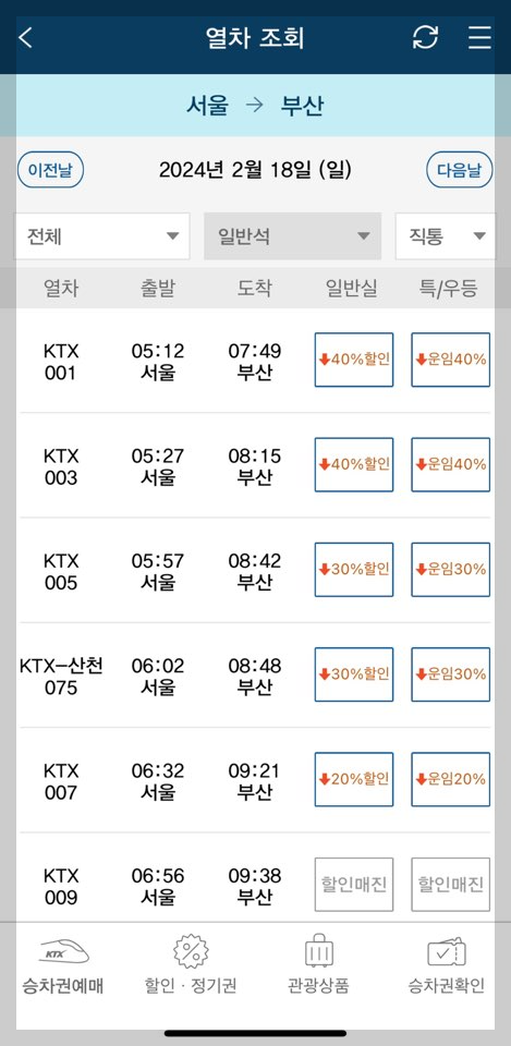 ※ 서울-부산 이용 시에 할인 전 금액은 59,800원 이지만 30% 할인 적용시 17,900원 , 40% 할인 적용 시에는 23,900원까지 할인 혜택을 받아서 훨씬 저렴한 비용으로 예매 할 수 있다.