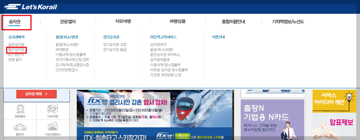 ① 레츠 코레일 홈페이지(https://www.letskorail.com/) 로그인 후 > 승차권 클릭 > 할인 승차권 으로 들어간다.