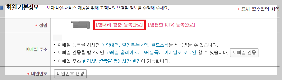 ※ 청년 인증은 코레일 회원가입 후 로그인 > 레츠 코레일 홈페이지> 마이페이지> 할인서비스 대상자격 등록 중 '힘내라 청춘' 클릭> 힘내라 청춘 인증 하면 힘내라 청춘 등록완료 라고 뜬다. 그럼 바로 '힘내라 청춘' 할인권 예매 가능하다.