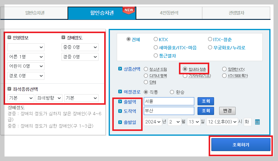 ② 출발지와 도착지 가는 날짜, 시간을 선택한 후에 열차 조회하기를 클릭한다.